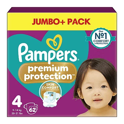 Pampers Premium Protection Size 4, 62 Nappies, 9kg 14kg, Jumbo+ Pack