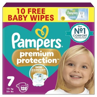 Pampers Premium Protection Size 7, 128 Nappies, 15kg+, Double for Skin and Against leaks