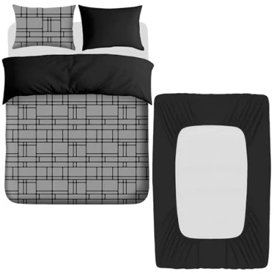 Pamposh 4 Pcs Double Duvet Set with Matching Black Fitted Sheet 40 cm Extra Deep Pocket UltraSoft Breathable Premium Microfibre Reversible Quilt Cover Bedding For All Seasons