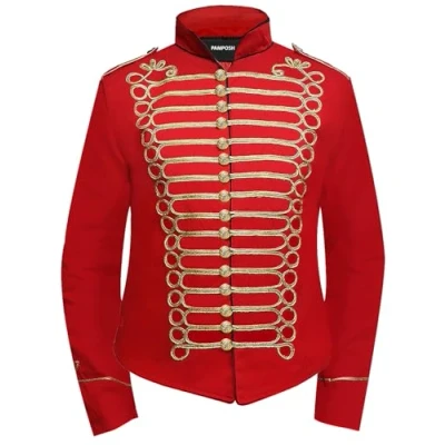 Jacket Style - Womens napoleonic lightweight military parade gothic jackets made with premium coton fabric. Closure Type - Metal buttons fastening to the front with high quality gold or silver trimmings. Studs to the front and shoulder straps enhance the beauty. Premium Quality Fabric - Made with high quality coton fabric on the outer and polyester satin lining on the inner. Design - High quality buttons and ribbons that will last long. Long sleeves design. Applications - Great for musicians, dancers, singing bands, marching bands to wear whilst performing. Suitable for birthday, thanksgiving, halloween, christmas and theme parties gifts.