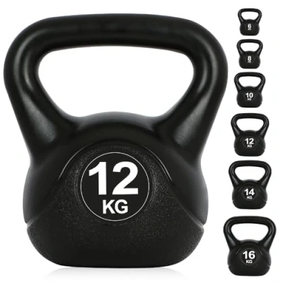Heavy Duty Material Kettlebell --- Kettlebell is coated in durable HDPE plastic and filled with concrete, this kettle bell won’t do too much damage to the floor when dropped compared with the iron models. Ergonomic Handle --- This kettlebell's ergonomically crafted handle, with optimal width and thickness, offers a secure and comfortable grip. Designed for easy two-handed use, it ensures stability and reduces hand pressure during swings, cleans, and presses. Robust and Sturdy --- Our kettle bell is designed to last with a strong vinyl coat HDPE hard shell which ensures good durability and easy clean. Flat bottom for increased stability. Ideal for use indoors or outdoors for your workout needs. Full body Exercise --- Kettlebell provide fully body exercise for home gym, deltoid, rectus abdomins, previc floor muscles. Just start to do it, improve your body functions to be a exercise star. Multiple Size to Choose --- We provide different weight kettlebell to choose to satisfy with your different fitting stages, 6KG, 8KG, 10KG, 12KG, 14KG, 16KG.