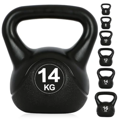 Heavy Duty Material Kettlebell --- Kettlebell is coated in durable HDPE plastic and filled with concrete, this kettle bell won’t do too much damage to the floor when dropped compared with the iron models. Ergonomic Handle --- This kettlebell's ergonomically crafted handle, with optimal width and thickness, offers a secure and comfortable grip. Designed for easy two-handed use, it ensures stability and reduces hand pressure during swings, cleans, and presses. Robust and Sturdy --- Our kettle bell is designed to last with a strong vinyl coat HDPE hard shell which ensures good durability and easy clean. Flat bottom for increased stability. Ideal for use indoors or outdoors for your workout needs. Full body Exercise --- Kettlebell provide fully body exercise for home gym, deltoid, rectus abdomins, previc floor muscles. Just start to do it, improve your body functions to be a exercise star. Multiple Size to Choose --- We provide different weight kettlebell to choose to satisfy with your different fitting stages, 6KG, 8KG, 10KG, 12KG, 14KG, 16KG.