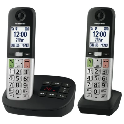 Panasonic KX TGU432EB Digital Cordless Landline Phone with Answering Machine, Base Unit & 2 Handsets, LCD Display, Fav Call, Torchlight, Hearing Aid Compatible, Black Silver