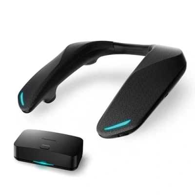 Panasonic SC GNW10 Wireless Neck Speaker, Gaming Speaker with AI Noise Cancelling Mic, 2.4GHz Low Latency, 4ch Surround Sound, USB C Charging, PC/PS4/PS5/Switch, Black