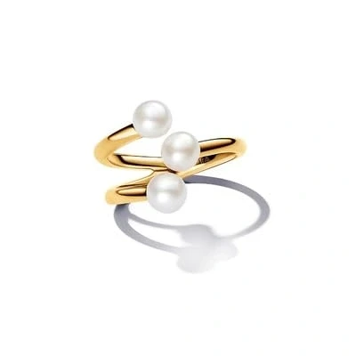 The treated freshwater cultured pearl open ring gives a classic design a modern touch The gold-plated ring consists of three separate bands with a treated freshwater cultured pearl at the end of each band The ring is not adjustable and should not be opened, bent or compressed Each treated freshwater cultured pearl is unique and may vary in size and colour. Our freshwater cultured pearls are treated with bleach and shine enhancers The product will not be shipped in a box. This must be purchased separately