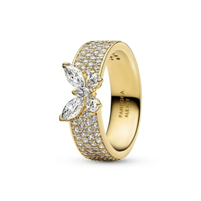 Lift your look in instant glamour with this gorgeous ring from Pandora. Crafted with gold plated sterling silver, this thick band ring features a white crystal butterfly in the centre, with a thick band of white pavé crystals. A beautiful choice, this ring would make a gorgeous gift.Sterling silverWhite pavé crystalsCrystal bow motifThick ring design