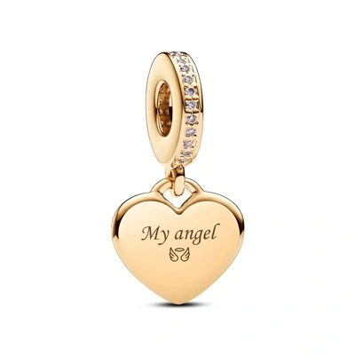 AmazonShow your love with our engravable heart charm pendant Make a romantic statement with a personal message on the heart-shaped pendant This 14k gold plated charm is also adorned with a row of pave stones on the connecting ring giving it an extra sparkle Compatible with Pandora Moments bracelets Dimensions: depth: 1.5 mm, height: 11.5 mm, width: 11.8 mm