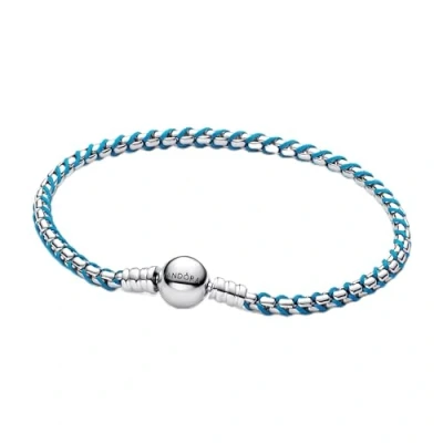 Sterling silver braided box chain combined with a turquoise textile cord for a unique look Crafted from sterling silver for a cool, shiny finish that is durable and stylish The comfortable and durable textile cord is available in many colours and gives the jewellery playfulness Perfect for anyone who loves eye-catching and creative jewellery The product will not be shipped in a box. This must be purchased separately. The item is only compatible with items from the Pandora Moments collection