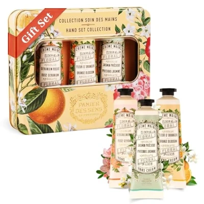 π HAND CREAM GIFT SET - The perfect hand cream gift set for any occasion, featuring a fresh and floral design. This set includes a trio of hand creams in our signature scents: Orange Blossom, Jasmine & Geranium. Whether it's for a birthday, wedding favor, Christmas, or a farewell gift, this elegant set is sure to delight. It's a thoughtful way to nourish, soften, and protect hands while celebrating special moments. β¨π§ ULTRA NOURISHING CLEAN FORMULA - Our gift set contain moisturising hand lotion thanks to the combination of olive oil and sweet almond oil. Olive oil is Known for its moisturising, regenerating and softening properties, its many benefits are perfectly suited to the needs of dry skin & Sweet almond, rich in vitamins A and E, to deeply nourish the skin. All the active ingredients in our products have been selected for their naturalness, to offer you hand cream with 96% natural ingredients. πβ βπΌπΉβORANGE BLOSSOM, JASMINE, GERANIUM HANDCREAM - Orange Blossom : white flowers with a floral, sunny and tangy fragrance. Jasmine : a floral scent brightened by the glow of slightly honeyed fruity notes. Rose Geranium : offers an enchanting floral scent with notes of rose, peony, and white musk. π DERMATOLOGICALLY TESTED - Dermatologically tested, our gift set for women offer natural skincare that nourishes and protects the skin while leaving hands soft and moisturized. Apply as often as needed for lasting softness from fingertips to wrists. πβ PACKED IN A LOVELY METAL BOX - Ready to gift! This beautifully design Tinbox can be infinitely reusable for storing accessories or jewelry with a little french touch. Panier des Sens is dedicated to sustainability, ensuring that our packaging is both durable and recyclable.