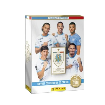 To celebrate the 125th anniversary of Olympique de Marseille, Panini unveils an exclusive collection of 50 cards, tracing the highlights of the 2024-2025 season. In this collector's box, you'll find 25 classic cards representing the coach and the entire squad, as well as 25 special cards with spectacular designs, highlighting the must-have players of the year. Each box also contains 2 random UFO cards, made of Optichrome material! Among them, some are numbered, others have printed signatures… and the rarest contain a REAL SIGNATURE of one of the 5 OM players: Rulli, Bennacer, Kondogbia, Greenwood or Luis Henrique!, Manufacturer: Panini