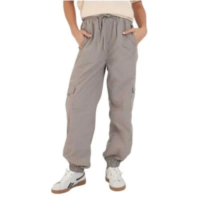 Packable nylon pants Two knee-level pockets Two regular pockets Elastic waistband with drawcord Elastic ankle cuffs