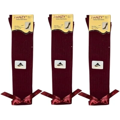 Panzy 3 Girls Bow Knee High Ribbed School Long Length Cotton Stretch With all size & colour (UK 4 6.5), Burgundy Socks
