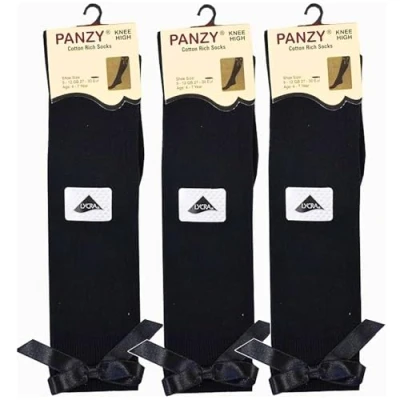 Panzy® 3 pairs Girls Bow Knee High School Plain Long Length Cotton Stretch With all size & colour (Set of pairs) (UK 6 8.5 (EU 23 26.5) fits 2 4 yrs, Black)