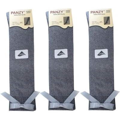 Panzy® 3 pairs Girls Bow Knee High School Plain Long Length Cotton Stretch With all size & colour (Set of pairs) (UK 6 8.5 (EU 23 26.5) fits 2 4 yrs, Grey)
