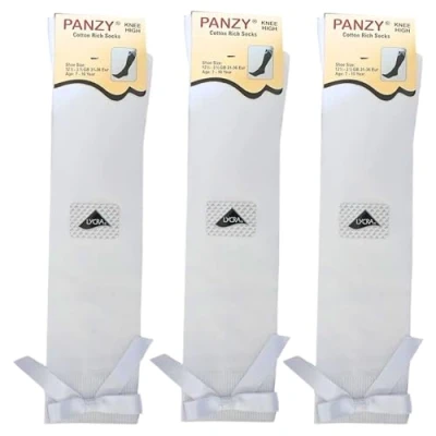 Panzy® 3 pairs Girls Bow Knee High School Plain Long Length Cotton Stretch With all size & colour (Set of pairs) (UK 6 8.5 (EU 23 26.5) fits 2 4 yrs, White)
