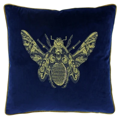 Paoletti Cerana Embroidered Bee Piped Velvet Feather Filled Cushion Blue One Size