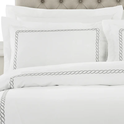 The Cleopatra Pillowcase features a rope embroidered border on a crisp white background. Made of 100% cotton with a 200 thread count making this hotel-quality pillowcase amazingly soft. This pillowcase has an envelope closure and opulent oxford border detailing. Cleopatra is fully machine washable and suitable for ironing.