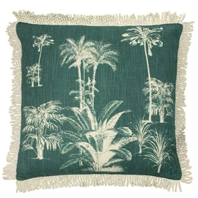 Featuring a palm design printed on a cotton slub fabric. Complete with a cotton slub reverse, braided cotton fringe edge and hidden zip closure. Made of 100% Cotton, making this cushion super comfy and durable. Machine Washable at 30 Degrees and Line Dry Only. Insert included.