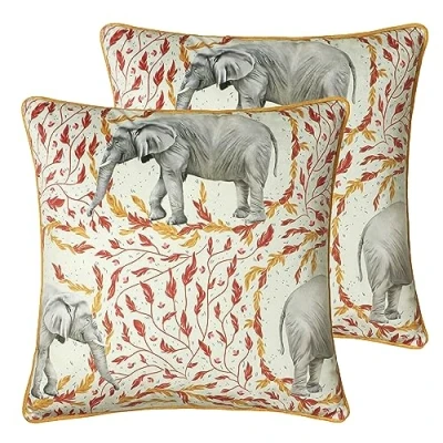 Featuring African Elephants, on a backdrop of decorative foliage. Complete with soft velvet reverses, piped edging and hidden zip closures Made using 100% Polyester these cushions are super soft yet durable. Dry CleanOnly and Do Not Iron.
