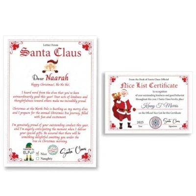 Pack contains: Christmas letter from santa personalised 2025 (certificate size - 148 x 210 mm, letter size - 210 x 297 mm) with envelope. Premium quality cards: Letter from santa certificate which allows you to write on them using any pen. Material: These santa letters 2025 are printed on high quality paper and premium quality certificate. Click on "Customise Now" and Enter Your Text. Usage: Our santa nice list certificate is a great way to encourage them to keep up the good behavior they have been exhibiting this year. Origin: Manufactured and dispatched from the UK with papa prints.