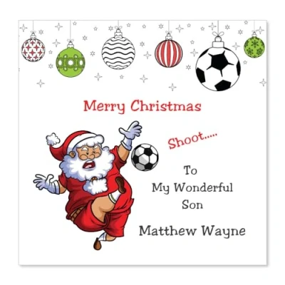 PACK INCLUDES: Christmas card for son of size 145 x 150 mm with envelope. Click "Customise Now" to add your name on the front side of the card. PREMIUM QUALITY CARDS: Xmas cards son are blank on the inside and uncoated which allow you to write on them using any pen. MATERIAL: These christmas card son is printed on premium quality 350 GSM FSC certified cards. USAGE: Our football christmas cards is offers a perfect and convenient way to share your holiday greetings, express your affection and fun notes by giving our christmas cards to son. MADE IN THE UK: Manufactured and dispatched from the UK with Papa Prints.