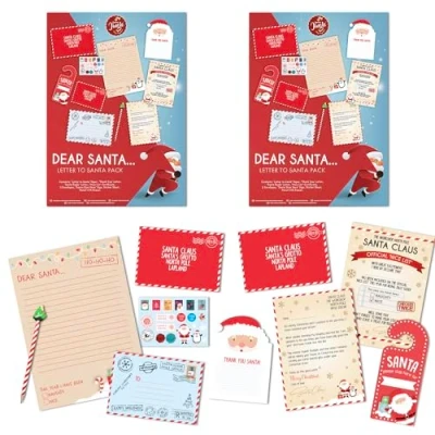 2-Pack Santa Letter Writing Kit: Includes 2 complete letter-writing kits for kids, each providing a fun way to write to Santa during the Christmas season. Complete Kit Contents: Each kit includes 1 letter to Santa, 1 reply letter from Santa, 1 thank-you letter, 1 large envelope, 1 small envelope, 1 "Santa Stop Here" door hanger, 1 sticker sheet, and 1 pencil with eraser. Engaging Christmas Activity: Kids will be excited to write their Christmas lists to Santa, personalise their letters with stickers, and decorate the "Santa Stop Here" sign for Christmas Eve. Creative and Fun: The kits offer a chance to personalise letters and crafts, making Christmas more interactive and fun for children during the holiday season. Perfect for Gifting or Group Activities: This 3-pack is ideal for family Christmas activities, gifting to siblings, or as stocking fillers to get kids in the holiday spirit.