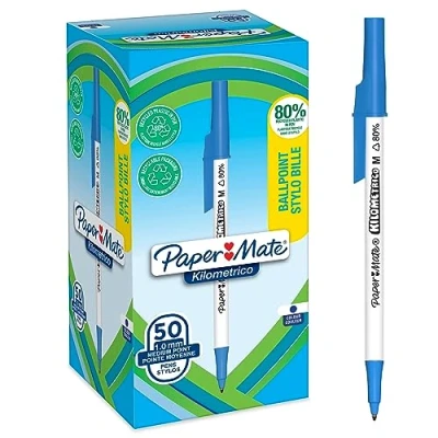 Paper Mate Kilometrico Ballpoint Pens Long Writing with Medium Point (1.0mm) Blue Ink 80% Recycled Plastic 50 Count