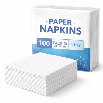 PACK SIZE: 100 white paper napkins per pack, perfect for large gatherings, parties, and catering events DIMENSIONS: Each napkin measures 30 x 30 centimetres, providing ample surface area for various dining needs MATERIAL QUALITY: 1-ply construction offers a balance of softness and strength for comfortable use during meals VERSATILE USE: Suitable for everyday dining, special occasions, weddings, restaurants, and general catering purposes CONVENIENT STORAGE: Compact packaging allows for easy storage and accessibility when needed for various occasions