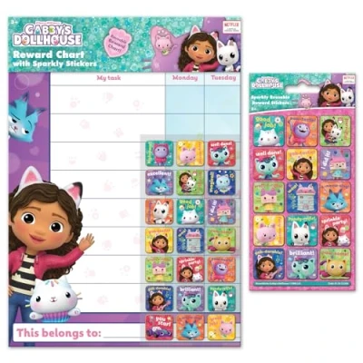 ✅ REWARD CHART - This official licensed reward chart is specially designed to help parents reward good behaviour such as reading and spelling bath-time or potty training eating their greens or just good behavior during playtime There are spaces for up to eight areas so you can decide which area needs that extra little 'well done' 💜 OFFICIAL PRODUCT - Official high-quality Reward Chart and extra Reward Stickers featuring all of your child's favourite Gabby's Dollhouse characters. We use the best materials to ensure that our stickers are wonderfully detailed and coloured. ✨ SPARKLY STICKERS - This reward chart is glossy and the detailed sparkly stickers come in a range of designs, also the chart can be wiped clean if need be. 🏆 REWARDS WORK - Saying well done to your child is one of the best ways to promote their good behaviour, and what better way to do it with some wonderful stickers 😍 WONDERFUL DESIGN - As always we use the highest-quality materials to ensure that you and your children can enjoy these fantastic colourful charts. The charts have a wonderfully vibrant design and the foiled stickers have a sparkly finish with detailed characters and phrases, Manufacturer: Paper Projects