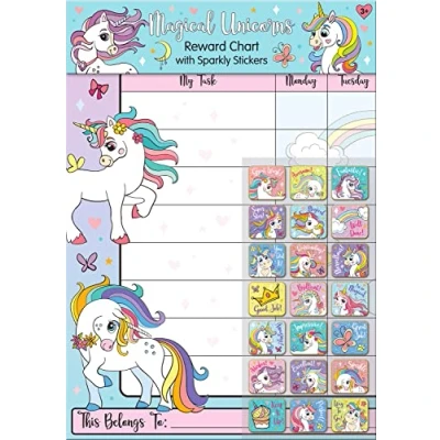 SPARKLY REWARD STICKERS - This reward chart is glossy and the detailed sparkly foiled stickers are reusable, also the chart can be wiped clean if need be. Other reward stickers can also be used including our wide range of reward stickers! HOME TEACHING - This reusable reward chart is specially designed to help parents reward achievements such as reading and spelling, bath-time or potty training, eating their greens, or just good behavior during playtime. There are spaces for the days of the week so you can decide which day needs that extra little 'well done'! REWARDS WORK - Saying well done to your child is one of the best ways to encourage good behaviour, and what better way to do it with some wonderful sparkly stickers! WONDERFUL DESIGN - As always we use the highest-quality materials to ensure that you and your children can enjoy this reusable glossy colourful reward chart. The chart has a wonderfully vibrant design and the foiled stickers have a sparkly finish with detailed Magical Unicorn characters and phrases. The fun-filled way to reward good behaviour and bring enjoyment to completing all those little tasks for little hands! 8 Stickers for every day of the week!, Manufacturer: Paper Projects Limited