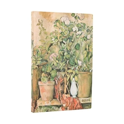 Paul Cézanne (1839-1906) was a French painter who is regarded as one of the greatest of the post-Impressionists. Terracotta Pots and Flowers saw Cézanne enter a new era of still life painting. Here he arranges everyday objects including a pitcher with potted geraniums inside the greenhouse at his father's estate near Aix-en-Provence. Maxi Size: Width: 135mm (5½") x Height: 200mm (8¼") x Depth: 23mm (¾") Daily Date Range: January 2026 - December 2026 Page Count: 400Pages Closure: Elastic Band Colour: Green GSM (paper weight): 80 Binding Type: Smyth Sewn Cover: Softcover Edge Printing: No Pouch Type: Back Cover Pouch Interior Paper: Smooth Ribbon Markers: 2 FSC-certified text paper Threaded stitching and glue, as needed Cloth headbands Acid-free sustainable forest paper Flexible cover and spine Monthly planner Conversion tables Year planner International dialling codes Mini calendars International holidays World time zones Note-taking pages Address book pages Name plate