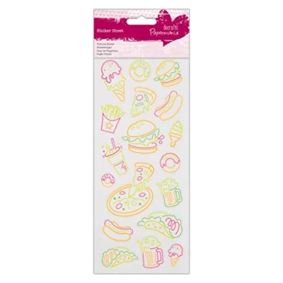 Use – easy and neat way to add character and fun to your crafty creations. You can sticker-bomb everything in sight. Themed stickers are perfect for invites, cards, scrapbook layouts or those with a particular theme, interest or hobby Self-adhesive – stickers are easy to use. Simply peel off of the backing sheet and stick on to desired area Essential – stickers are a must-have item in any crafters collection. They can let their imagination run wild and get creative with their makes Design – Build a creation around the stickers or add them in to designs you’ve already created. Try a ready-made sentiment or use individual stickers to create new designs Contents – The pack contains an assortment of yummy fast food designs in bright neon colours. Place on a black background for that glowing neon effect