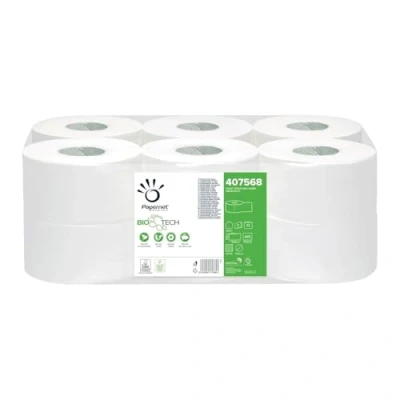 Use: ideal for high-traffic environments, reducing the risk of clogging and minimising the risk of extraordinary maintenance costs Technical specifications: 1 pack of 12 rolls of toilet paper 149.85 m each, 2-ply with micro-embossing, 405 sheets 9.5x37 cm, roll diameter 19.5 cm, core diameter 7.6 cm Bio Tech technology: Papernet's exclusive range of dermatologically tested products designed to ensure the cleanliness of pipes, sewage systems and waste water by effectively and naturally fighting pathogenic bacteria Environmental impact: paper products made of 100% pure pulp sourced from certified or controlled sources, prevents problems such as clogging, sediment in pipes and bad odours, with EU Ecolabel certification Toilet paper made of pure two-ply cellulose, ideal for high-traffic environments thanks to Bio Tech technology. Bio Tech is the exclusive range of paper products that effectively and naturally fight pathogenic bacteria thanks to Biologic Active Tissue Paper (BATP) technology. The Bio Tech range helps clean pipes, drainage systems and waste water, reducing the risk of clogging and minimising the risk of extraordinary maintenance costs. Roll length 149.85m x 405 tears, tear size 9.5x37 cm, roll diameter 19.5 cm, core diameter 7.6 cm.