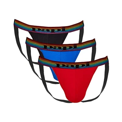 Papi Men's Pride 3-Pack Cotton Stretch Jockstrap can be found in the following sizes: Small, Medium, Large, and X-Large. These underwears are available in the following colors: Lychee, Prince Blue, Black, and Mimosa Yellow. Our underwear has been designed to make you look great while providing enough support to make these comfortable and durable. These undies are made from 95% and 5% Spandex to make you look and feel extraordinary all day. A Modern Fit: Each of Papi’s Jockstraps feature the classic Papi logo running across the entire waistband. Additionally, they have a contoured pouch with a center seam for extra support keeping you relaxed and comfortable These Jockstraps are incredibly durable and are highly fade resistant to washing and drying. To keep you feeling great all day, the waistband has been reinforced with cushioning for the ultimate satisfaction. How to Wash: All of Papi's underwear is washer and dryer safe! Machine wash cold with like colors. Only non-chlorine bleach when needed. You can dry these on tumble dry low but to keep them lasting long, we recommend hang drying. Do not iron
