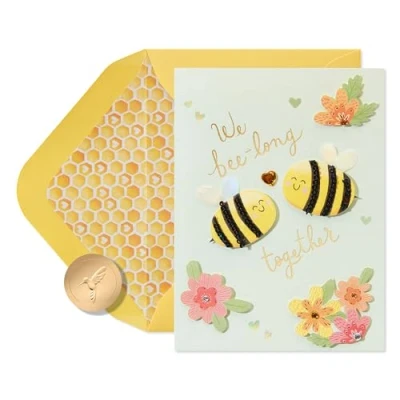 Front Message: We bee-long together Inside Message: Happy Anniversary to my sweetie (heart) Celebrate your day with this special die-cut Papyrus anniversary card featuring shimmering foils, sparkling gems, sequins, vellum, and unique attachments Card measures 4.5 in. x 6 in. Envelope and unique Papyrus gold seal included. Papyrus offers premium stationery, greetings cards, gift wrap, gift bags and entertaining products for everyday occasions and all holiday seasons--all with unique designs and quality embellishments!