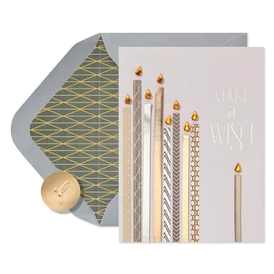 Front Message: Make a Wish Inside Message: May your happiest dreams come true. Have a wonderful birthday Celebrate someone's special day with this Papyrus birthday card that features shimmering foils, sparkling gems, and quality faux leather Card measures 4.5 in. x 6 in. Envelope and unique Papyrus gold seal included. Papyrus offers premium stationery, greetings cards, gift wrap, gift bags and entertaining products for everyday occasions and all holiday seasons--all with unique designs and quality embellishments!
