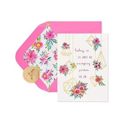 Front Message: Today is all about the amazing person you are Inside Message: Happy Birthday Papyrus birthday cards offer premium style, unique foil and glitter embellishments and uplifting wishes for anyone! Card measures 4.125 in. x 5.5 in.Extra postage may be required Papyrus offers premium stationery, greetings cards, gift wrap, gift bags and entertaining products for everyday occasions and all holiday seasons-all with unique designs and quality embellishments.
