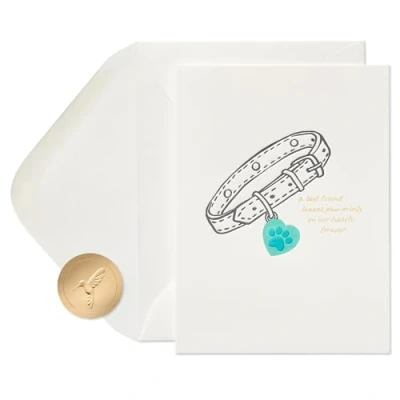 Front Message: A best friend leaves paw prints on our hearts forever Inside Message: Blank Sympathy greeting cards by Papyrus offer premium style, like this thoughtful card that features a dog collar with a blue heart-shaped tag with a paw print. Featuring a sympathetic message affirming that best friends leave paw prints on our hearts further embellished with metallic foil Coordinating envelope and unique Papyrus gold seal included. Card measures 6 in. x 4.5 in. Extra postage may be required Papyrus offers premium stationery, greetings cards, gift wrap, gift bags and entertaining products for everyday occasions and all holiday seasons--all with unique designs and quality embellishments.