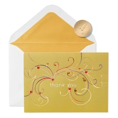 Front Message: thank you Blank inside for your personal message Send a message with this quality Papyrus thank you card featuring shimmering foils and sparkling gems Card measures 5 in. x 7 in. Envelope and unique Papyrus gold seal included. Papyrus offers premium stationery, greetings cards, gift wrap, gift bags and entertaining products for everyday occasions and all holiday seasons--all with unique designs and quality embellishments!