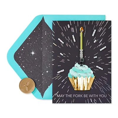Front Message: May the Fork Be With You Inside Message: Happy Birthday Papyrus birthday cards offer premium style, unique embellishments and uplifting wishes for anyone! Envelope and unique Papyrus gold seal included. Extra postage required. Papyrus offers premium stationery, greetings cards, gift wrap, gift bags and entertaining products for everyday occasions and all holiday seasons--all with unique designs and quality embellishments