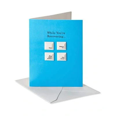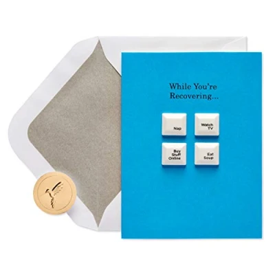 Front Message: While You're Recovering… Nap Watch TV Buy Stuff Online Eat Soup Inside Message: The key is to rest up and get well Send healing thoughts and a smile their way with a get-well card by Papyrus! Papyrus get-well cards offer premium looks for the special people in your life! Envelope and unique Papyrus gold seal included. Card measures 4.5 in. x 6 in. Extra postage may be required. Papyrus offers premium stationery, greetings cards, gift wrap, gift bags and entertaining products for everyday occasions and all holiday seasons--all with unique designs and quality embellishments