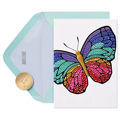 Front Message: Blank Inside Message: Cheers to you! Happy Birthday This Judith Leiber card by Papyrus features embossing with shimmering foil and decorative gems Green envelope with cream lining and unique gold Papyrus seal included. Card measures 4.5 in. x 6 in. Extra postage required Papyrus offers premium stationery, greetings cards, gift wrap, gift bags and entertaining products for everyday occasions and all holiday seasons--all with unique designs and quality embellishments!