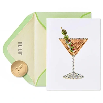 Front Message: Blank Inside Message: Cheers to you! Happy Birthday This Judith Leiber card by Papyrus features embossing with shimmering foil and decorative gems Green envelope with cream lining and unique gold Papyrus seal included. Card measures 4.5 in. x 6 in. Extra postage required Papyrus offers premium stationery, greetings cards, gift wrap, gift bags and entertaining products for everyday occasions and all holiday seasons--all with unique designs and quality embellishments!