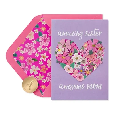 Front Message: amazing sister awesome mom Inside Message: ...all-around wonderful person This beautiful Mother's Day card by Papyrus features shimmering foil, glitter, gems and decorative attachments. Fuschia envelope with floral print liner and unique Papyrus gold seal included. Card measures 5 in. x 7 in. Extra postage required Papyrus offers premium stationery, greetings cards, gift wrap, gift bags and entertaining products for everyday occasions and all holiday seasons--all with unique designs and quality embellishments
