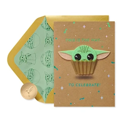 Front Message: This is the way...To Celebrate! Inside Message: Hope your birthday is the best in the galaxy! This cute birthday card by Papyrus features baby Yoda with shimmering foil, felt, stitching, a translucent paper overlay and quality paper attachments Gold envelope and unique Papyrus gold seal included. Card measures 5 in. x 7 in. Extra postage required. Papyrus offers premium stationery, greetings cards, gift wrap, gift bags and entertaining products for everyday occasions and all holiday seasons--all with unique designs and quality embellishments