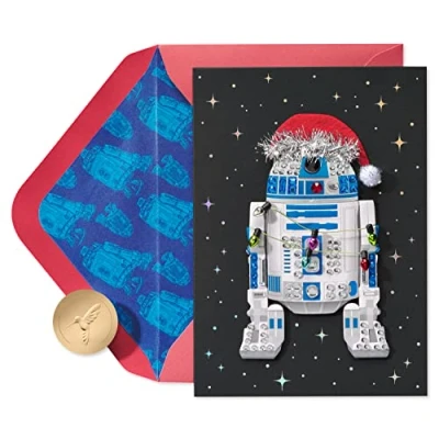 Front Message: Blank Inside Message: DROIDS TO THE WORLD AND MERRY FORCE BE WITH YOU! This Star Wars themed Christmas card features R2D2 in a Santa Hat and is embellished with shimmering foil, embossing, dimensional attachments, tinsel, pom-poms, cord, string lights and gems Red envelope with decorative R2D2 lining and unique Papyrus gold seal included. Card measures 5 in. x 7 in. Extra postage required. Papyrus offers premium stationery, greetings cards, gift wrap, gift bags and entertaining products for everyday occasions and all holiday seasons--all with unique designs and quality embellishments!