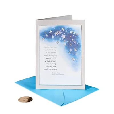 Front Message: In one of the stars I shall be living In one of them I shall be laughing And so it will be as if all the stars were laughing when you look at the sky at night ~ The Little Prince Antoine de Saint-Exupéry Inside Message: ...and there is sweetness in the laughter of all the stars...and in the memories of those you love With Heartfelt Sympathy This heartfelt sympathy card by Papyrus features shimmering foil, gems and quality paper attachments Blue envelope and unique Papyrus gold seal included. Card measure 5 in. x 7 in. Extra postage required. Papyrus offers premium stationery, greetings cards, gift wrap, gift bags and entertaining products for everyday occasions and all holiday seasons--all with unique designs and quality embellishments
