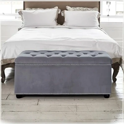 This product is made from strong wood with thick foam padding The lid is deeply cushioned and perfect for seating Beautiful Accessory to go with beds Upholstered in luxurious velvet Fully assembled Available in different colours and trims, Made in the UK