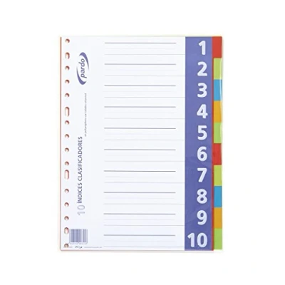 Coloured polypropylene indices dividers with heavy cardstock inserts Dividers – Set of 10 colours Thickness: 130 Micron; Folio size Model number: 651001