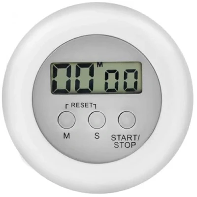 Practical and interesting kitchen timer with reset and countdown function. It can measure up to 99 minutes and 59 seconds. The two buttons allow you to adjust the selected time (minutes and/or second). Press the start button to start the timer, at the end of the countdown, the timer will sound. Press the stop button to stop the alarm. The timer has an adjustable stand on the back of the device and a magnet that allows it to be hung on any metal surface. Practical and space-saving. Beyond a specific use for the kitchen, it can help a person who has the notion of low time, who has less ability to execute and procrastination to improve their time management, children and adults will be able to work and live in an effective and orderly manner. Colour: White / Source: LR 44 battery (included) / Dimensions: 6.5 cm x 2 cm / Weight: 40 g / Max time measurement: 99min 59s